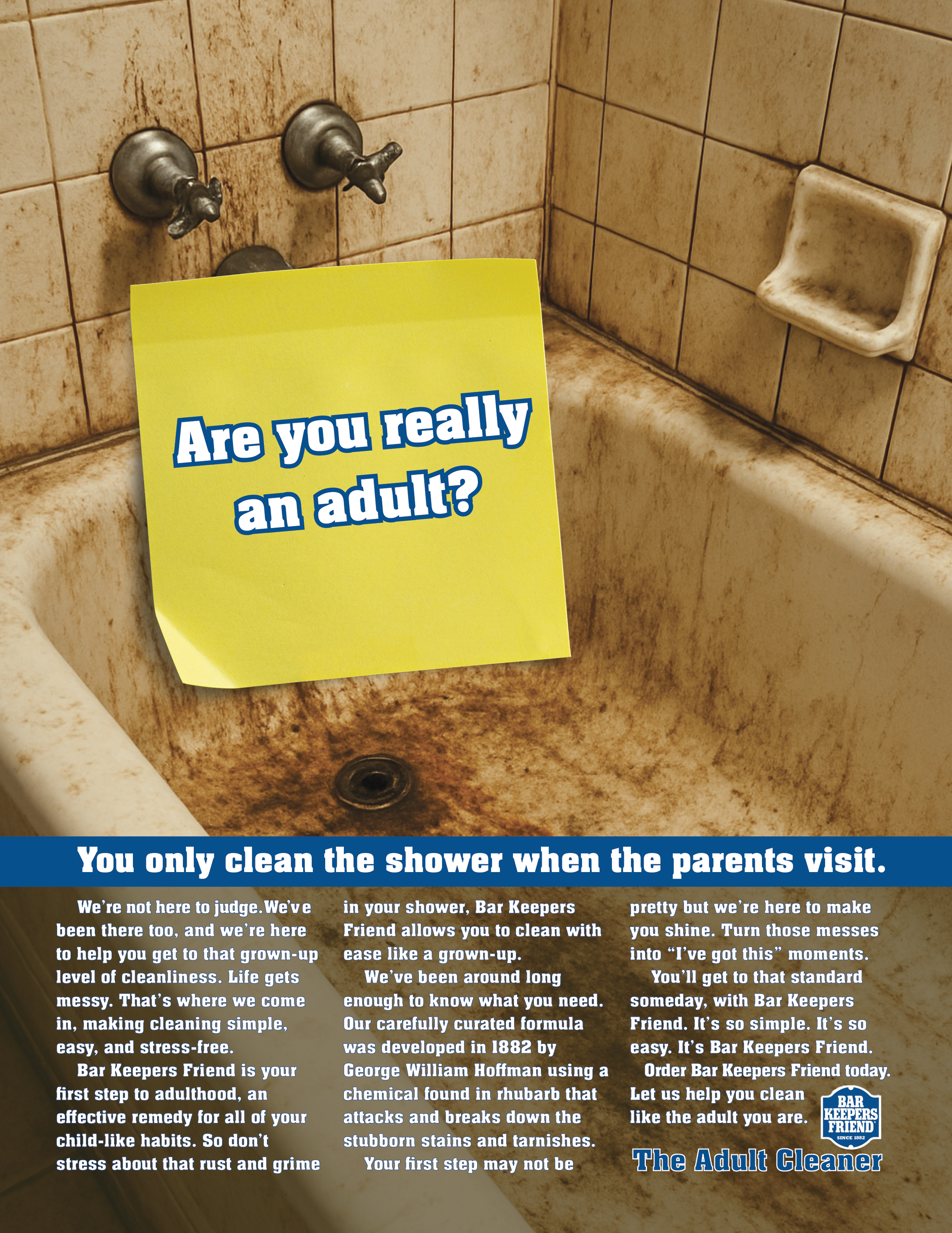Bar Keepers Friend has long been known as a reliable cleaning staple, but its dated image has kept it from connecting with college students who are discovering the challenge of cleaning up for an adult world. Although it may be an older brand, this campaign gives the brand a youthful refresh, proving that it can keep up with the chaos of college living. By asking the question, “Are you really an adult?”, this campaign challenges students to rethink their cleaning habits and measure their routines against the standards of The Adult Cleaner.