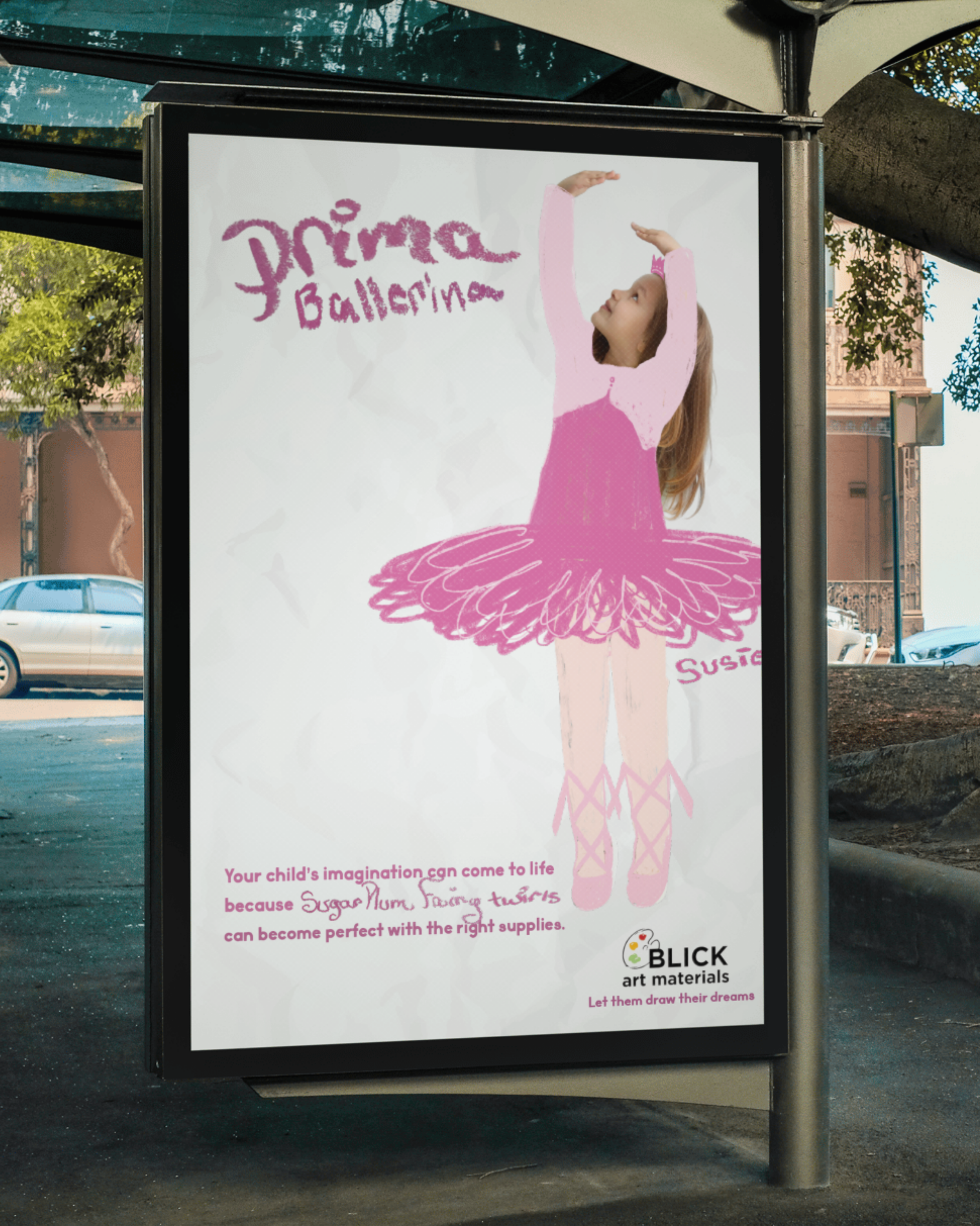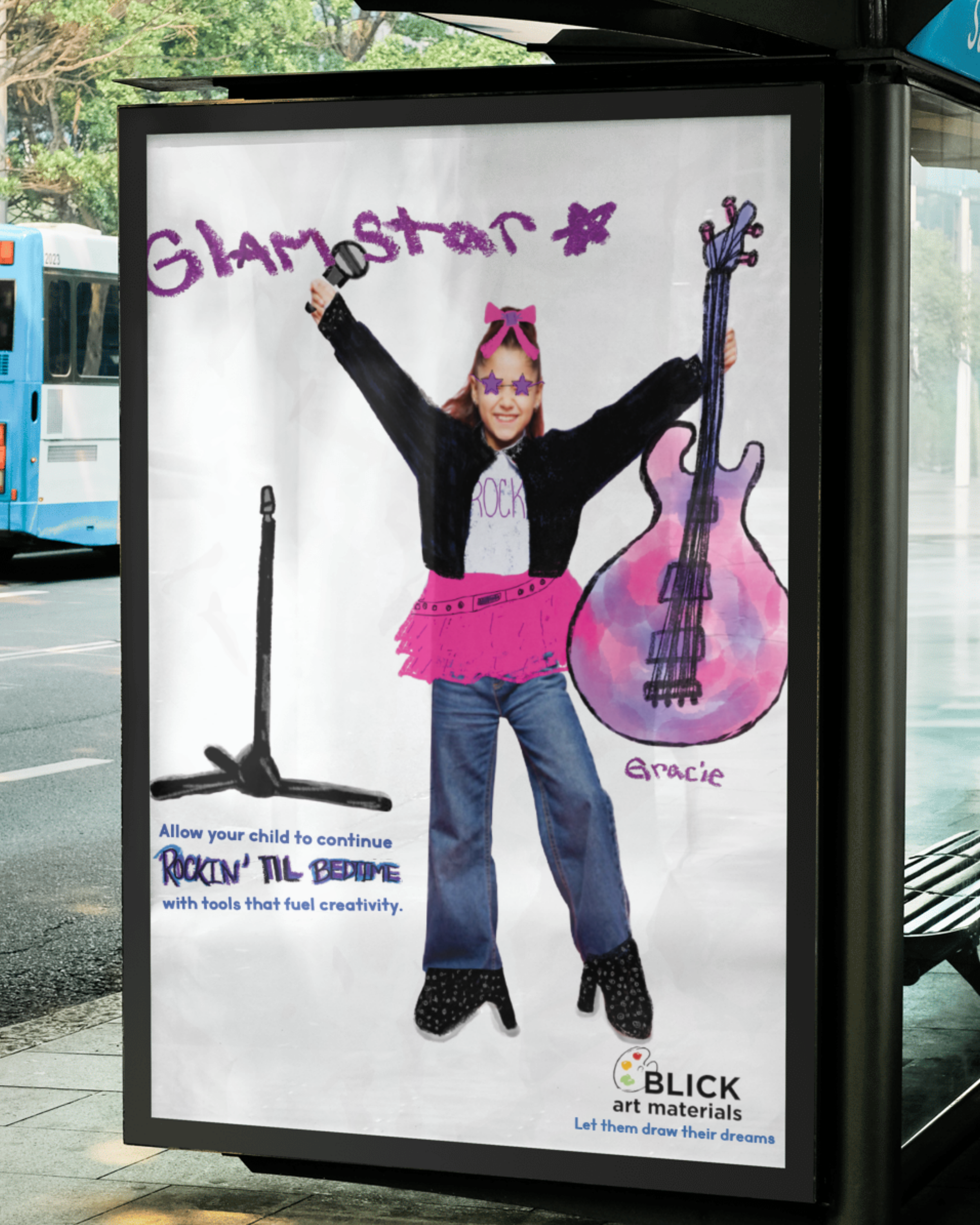 Placed at bus stops and family-centered neighborhoods, these transit ads meet parents in the middle of their daily routines. In moments of pause, they highlight the role of creativity in a child’s growth, encouraging parents to see art as more than play. By showcasing kids at different stages of development, the ads position Dick Blick as the one place that supports every step of their creative journey.
