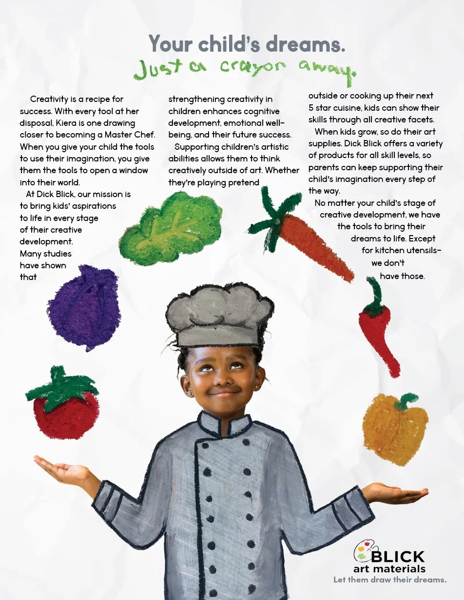 Dick Blick is a partner in childhood development. It empowers parents to nurture creativity at every stage, from early play to more advanced artistic growth. By framing art supplies as tools for learning and self-expression, the campaign taps into a parent’s desire to support their child’s full potential. With a wide range of products and easy online access, Dick Blick becomes the one reliable place for every step of a child’s creative journey.